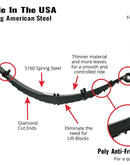 Using top-grade 5160 USA steel and advanced fabrication techniques, these leaf springs offer exceptional durability and performance. The deep-arched design eliminates the need for axle blocks, while the military wrap construction ensures strength and increased travel for more demanding conditions.